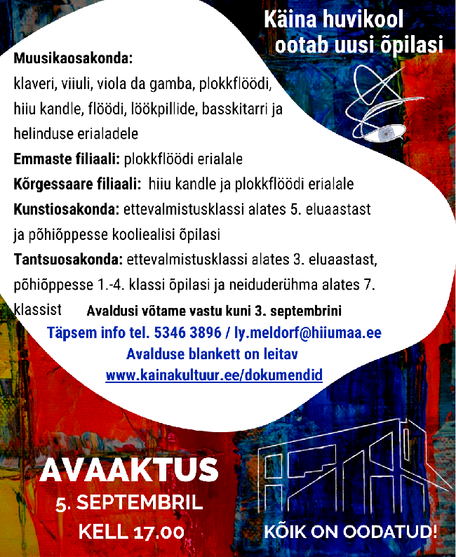 Avaldusi võtame vastu 3.septembrini. Avaaktus 6.septembril kell 17.00 (Hiiu mnt. 1c sisehoovis)