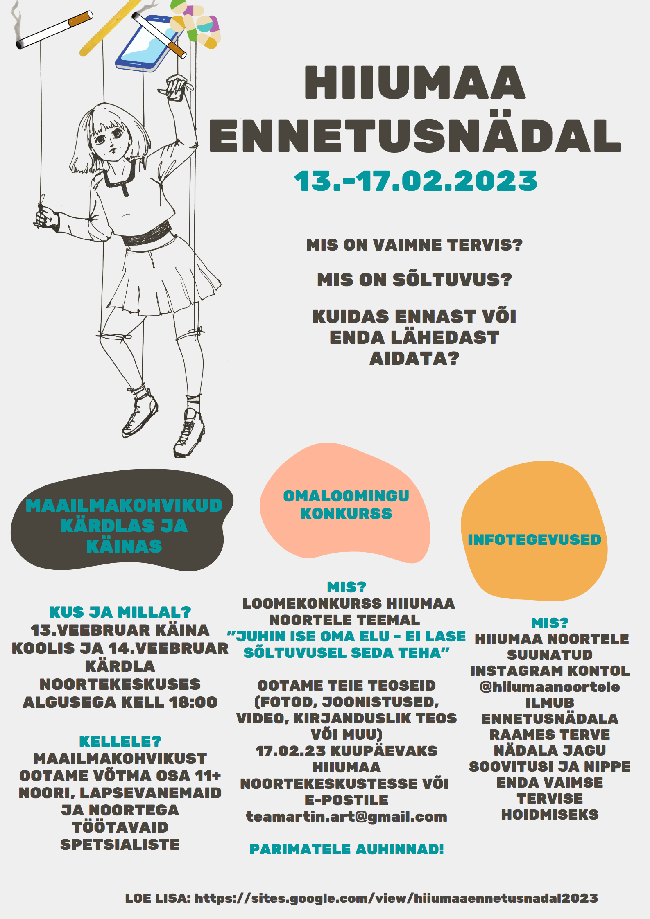 Anname teada, et 13.02-17.02.23 toimub Hiiumaa ennetusnädal, mille raames leiavad aset maailmakohvik, omaloomingu konkurss "Juhin ise oma elu - ei lase sõltuvusel seda teha" ja infosündmus veebis.